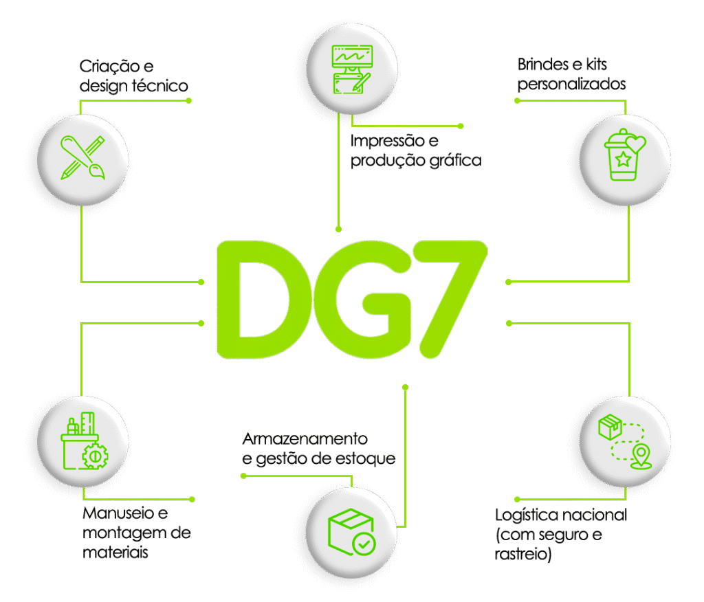 A DG7 cuida da criação, da produção, do estoque e da entrega e você volta a ter tempo para pensar no seu negócio.